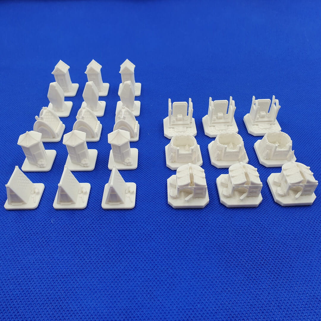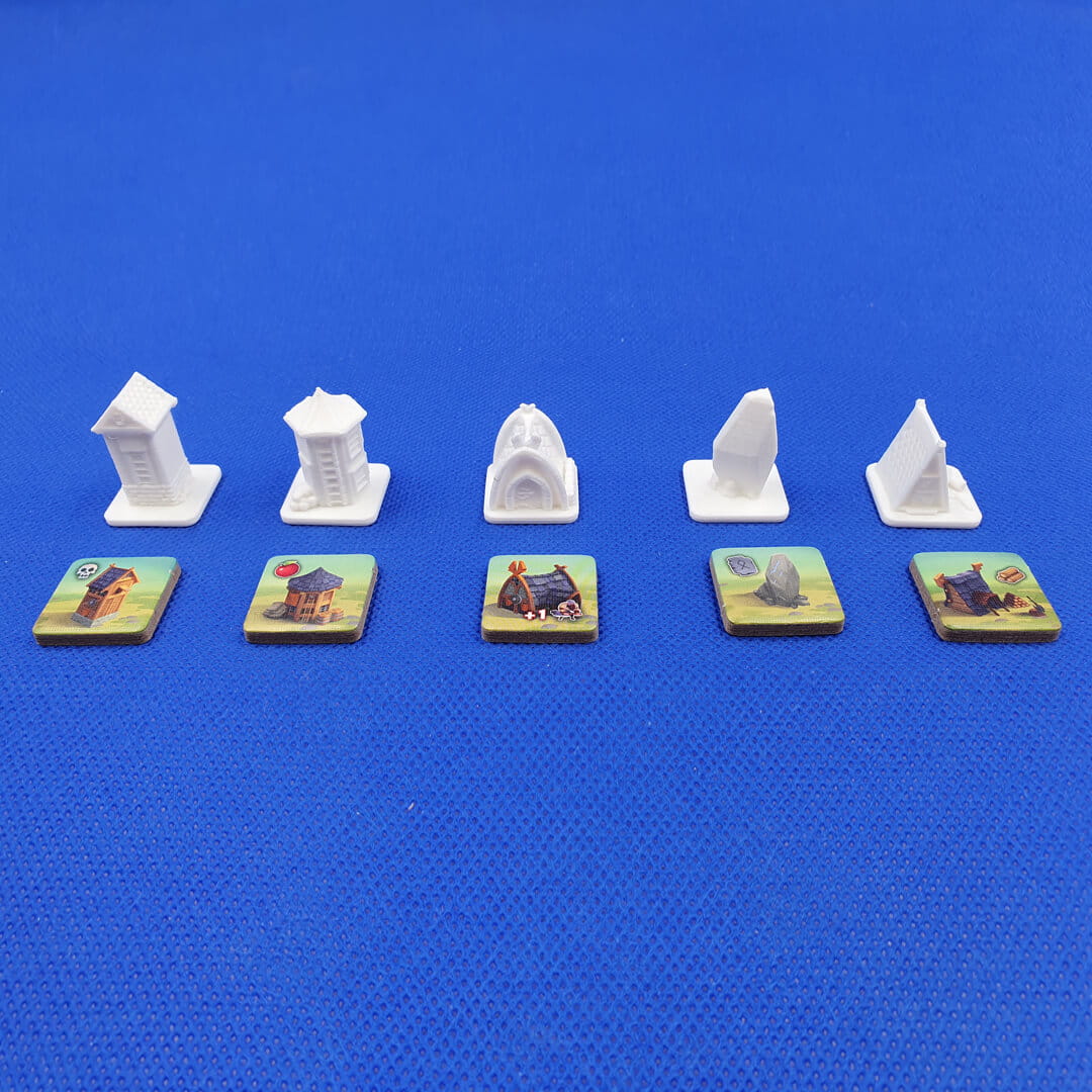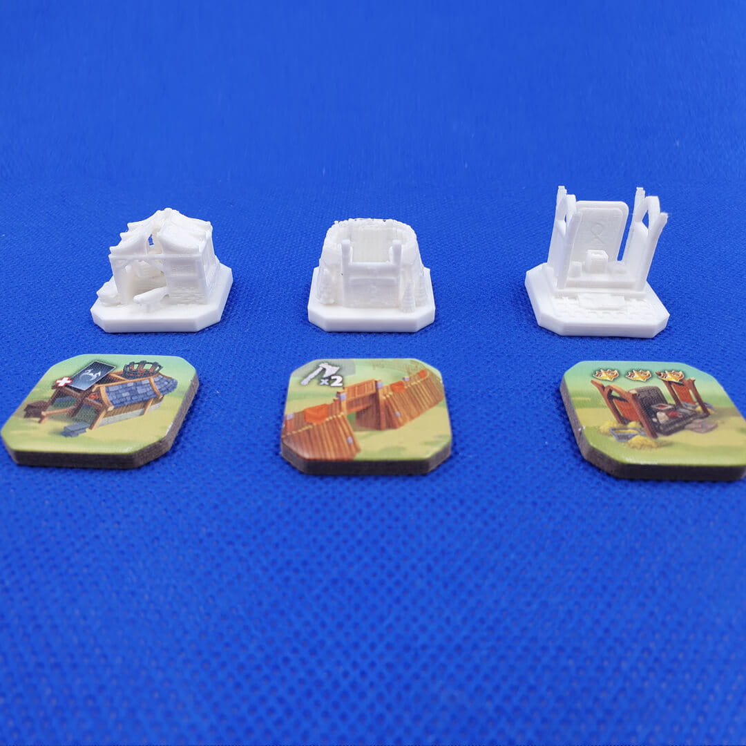 Każda budowla (mała i duża) występuje w liczbie 3 sztuk, co łącznie daje nam 24 dodatkowe trójwymiarowe elementy w grze. Modele są zaprojektowane w skali pasującej do pozostałych figurek z gry, idealnie dopasowane do pól na planszy, komponując się tym samym z całością zestawu.