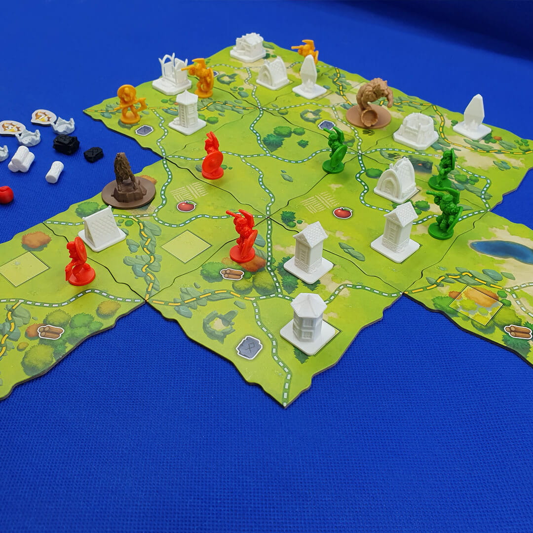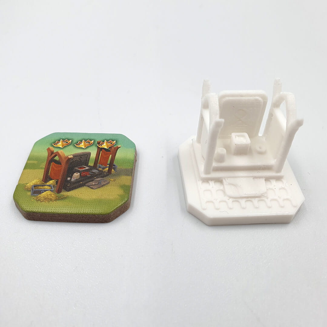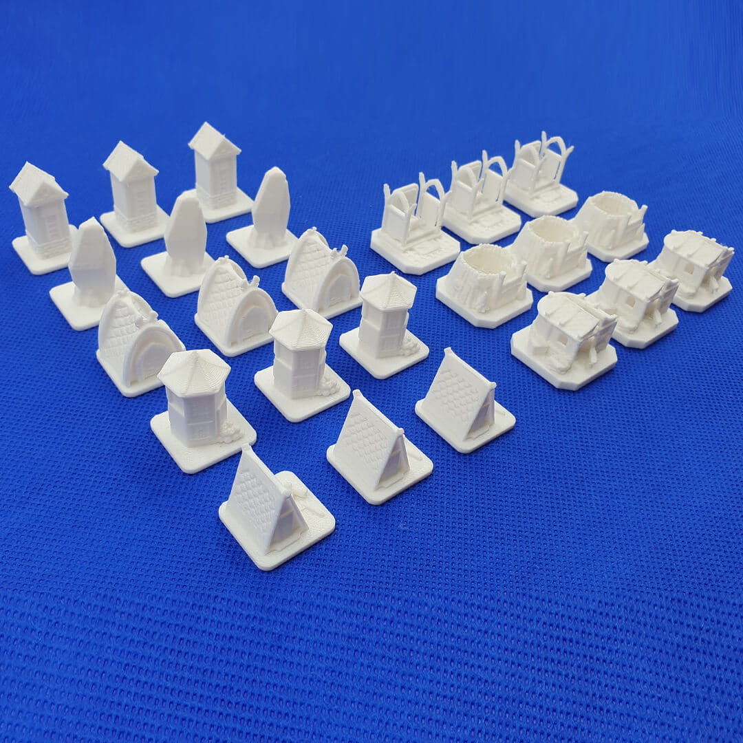 Każda budowla (mała i duża) występuje w liczbie 3 sztuk, co łącznie daje nam 24 dodatkowe trójwymiarowe elementy w grze. Modele są zaprojektowane w skali pasującej do pozostałych figurek z gry, idealnie dopasowane do pól na planszy, komponując się tym samym z całością zestawu.