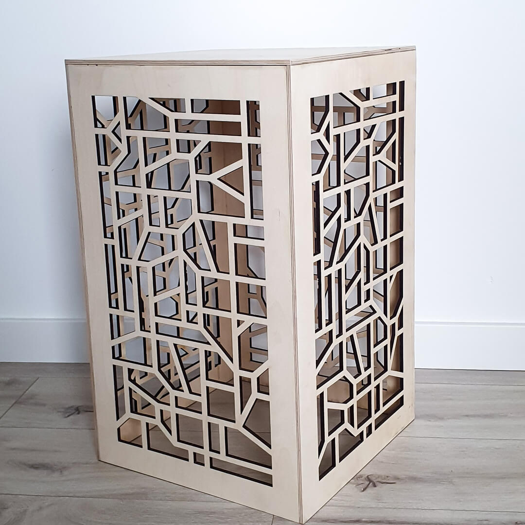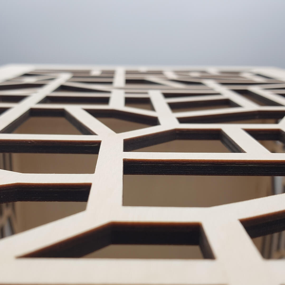 Kawowy stolik ażurowy wykonany jest z wysokiej jakości sklejki o grubości 6mm. Wszystkie cztery ściany stolika mają wycięty ażurowy kształt wielokątów, dzięki czemu widzimy wszystko na przestrzał, a cała konstrukcja sprawia wrażenie bardzo zwiewnej.
