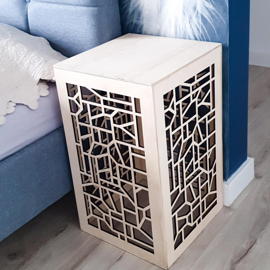 Wygląd i funkcjonalność stolika sprawdzi się również w sypialni. Przepiękna ażurowa konstrukcja wspaniale komponuje się przy małżeńskim łóżku w formie nocnych szafek. Z taką też myślą powstał cały projekt.