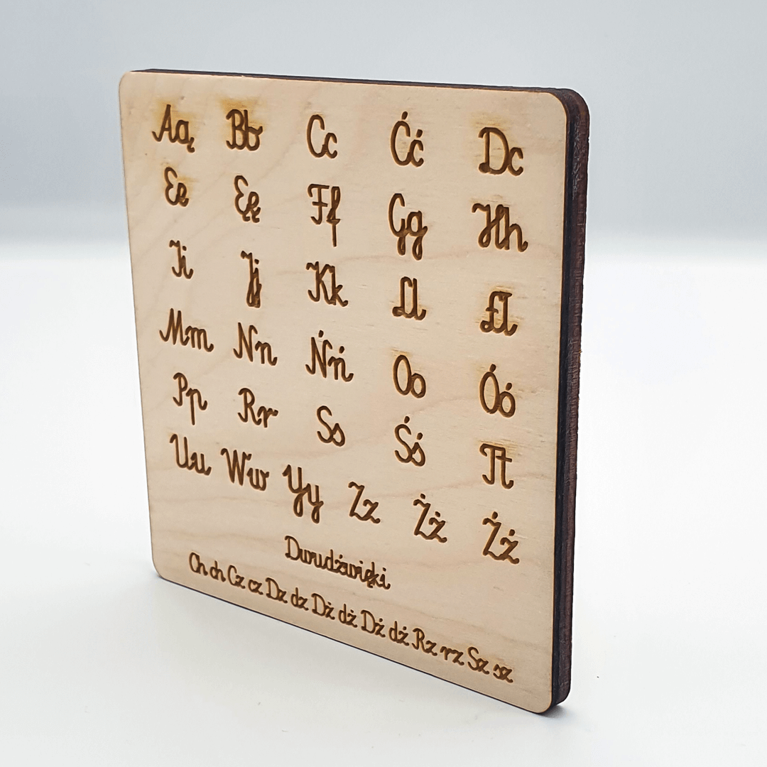Drewniana tabliczka dwustronna z najważniejszymi informacjami dla maluchów na początku drogi szkolnej, jakimi są polski alfabet oraz tabliczka mnożenia. To przedmiot, który powinien znaleźć się w plecaku każdego dziecka zaraz obok elementarza.