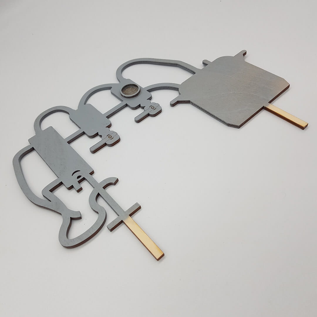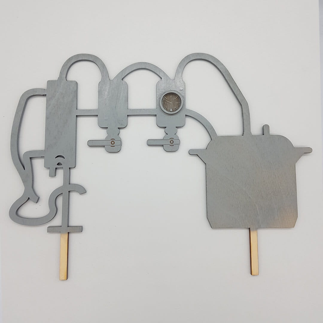 Humorystyczny topper przedstawiający aparaturę do produkcji alkoholu (popularny destylator) to oryginalny i zabawny akcent dekoracyjny, który z pewnością rozbawi gości na każdej imprezie. Wykonany z drewna i ręcznie pomalowany topper dodaje specyficznego charakteru Waszej imprezie.