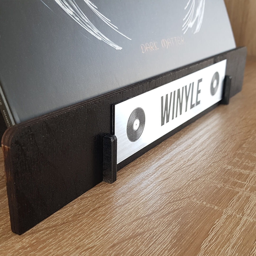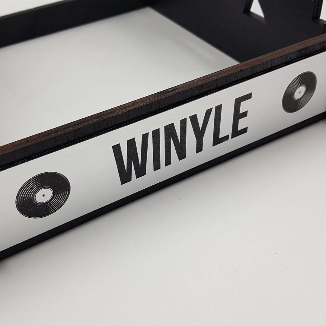 Ten wariant, widoczny na zdjęciach, wykonany jest z drewna malowanego na kolor czarny, co nadaje mu elegancji i nowoczesnego wyglądu. Przód zdobi srebrna tabliczka z napisem "WINYLE" oraz grafiką płyt winylowych po bokach. To rozwiązanie idealne dla osób ceniących minimalistyczny i industrialny styl. -