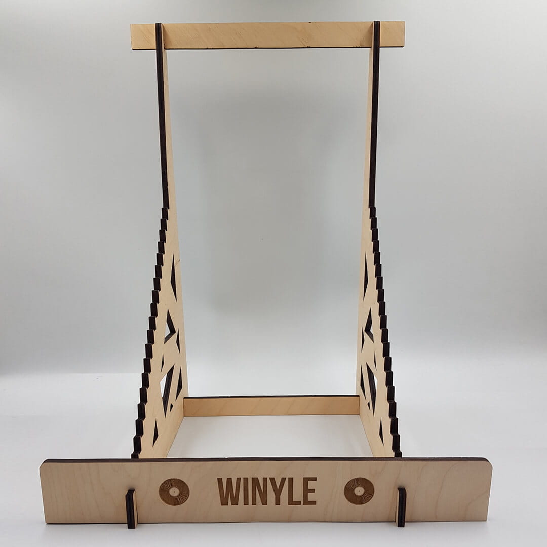 Alternatywna wersja wykonana jest z drewna w jego naturalnym odcieniu. Z przodu znajduje się grawerowany napis "WINYLE", który podkreśla klasyczny, ciepły charakter stojaka. To wybór dla miłośników ponadczasowego stylu i naturalnych materiałów.