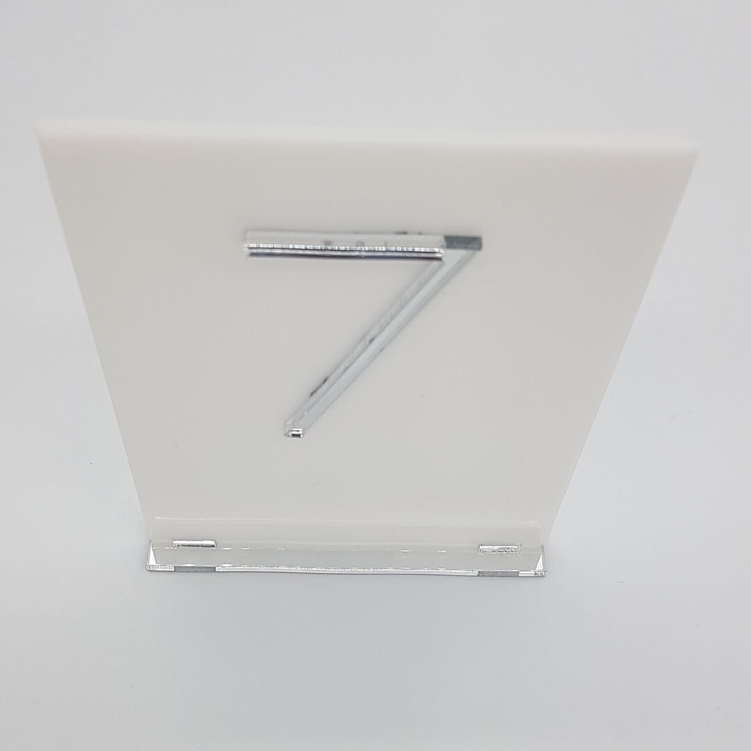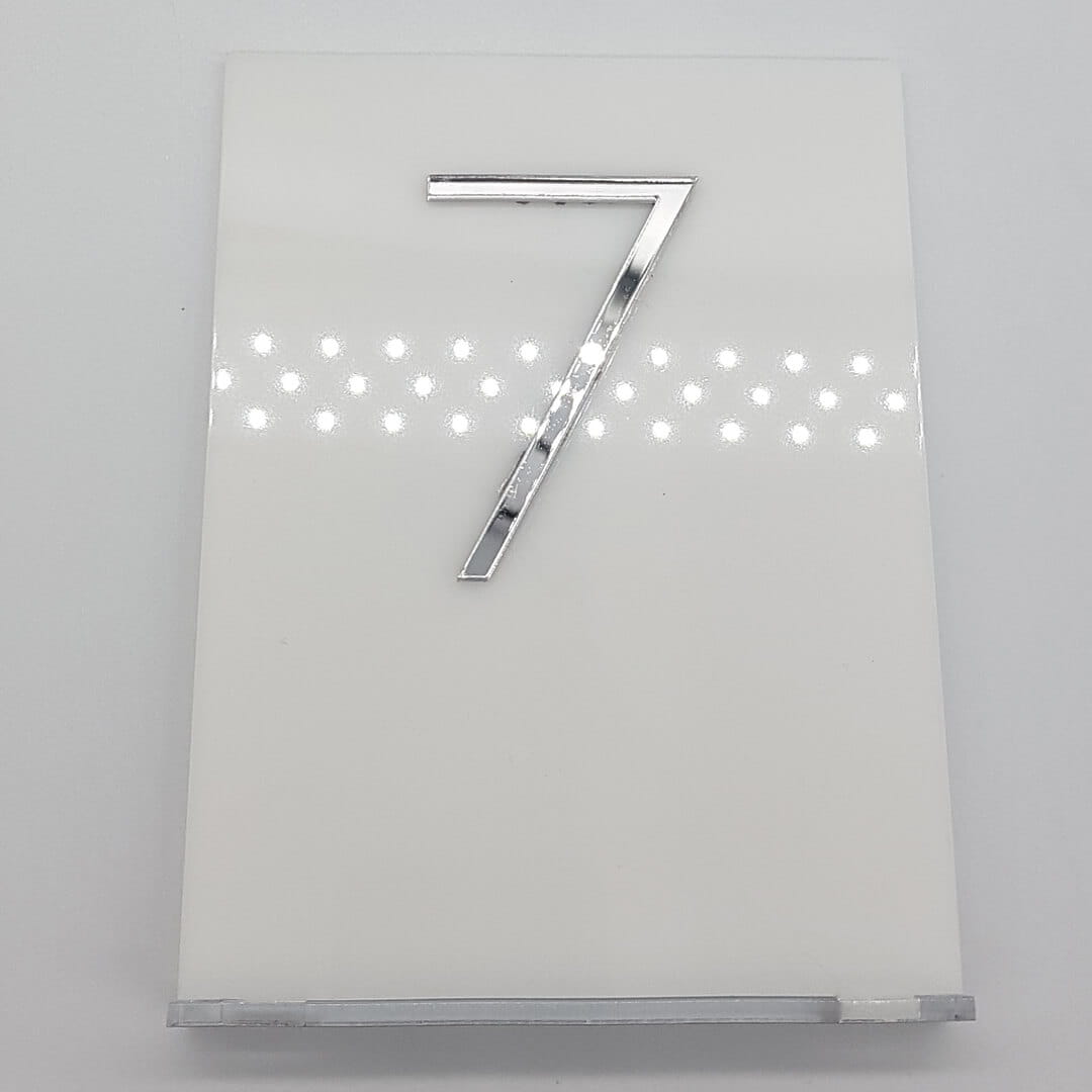 Tabliczki wykonane są z 3mm pleksi w kolorze białym oraz lustrzanym. Podstawka oraz numer w kolorze lustra, tło białe.
