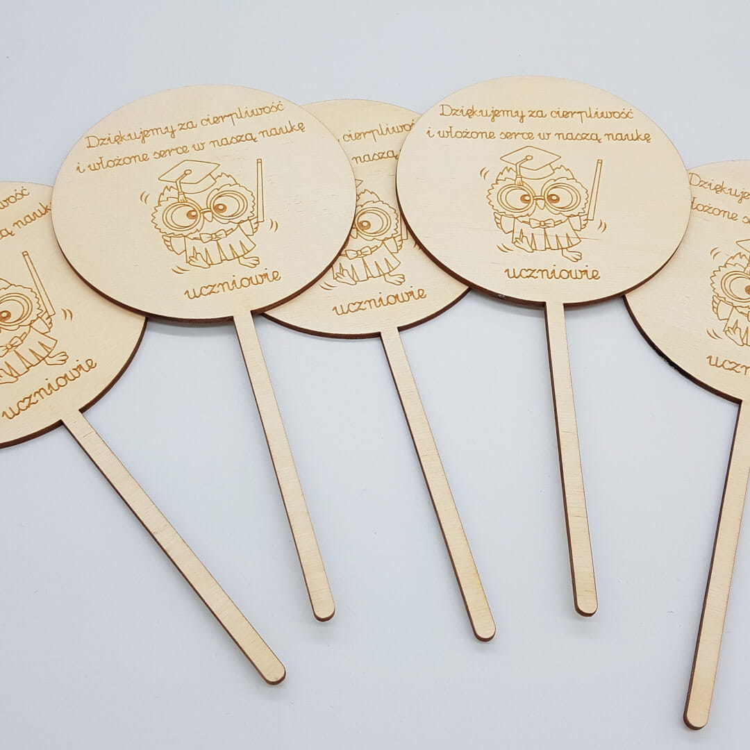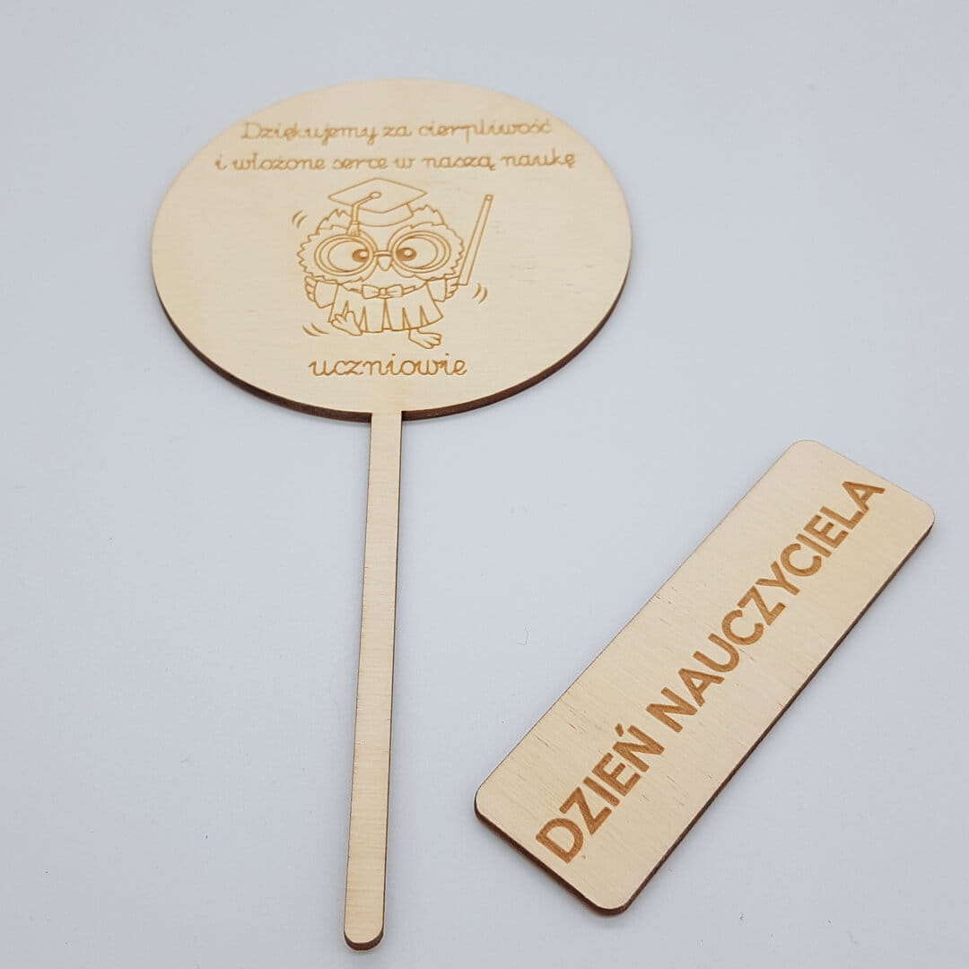 Topper na dzień nauczyciela to życzenia i dekoracja prezentu, najczęściej kwiatów, skondensowane w drewnianej, grawerowanej ozdobie. Sami możecie ustalić tekst, który znajdzie się na topperze.